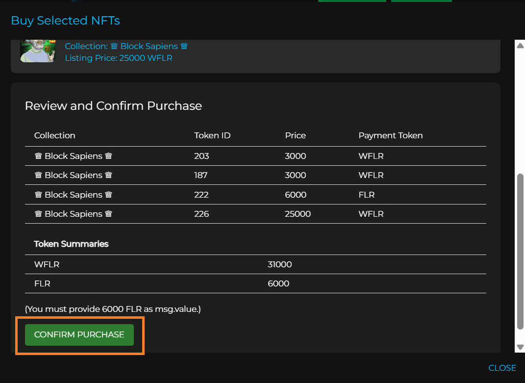 Review your order details carefully to ensure everything is correct before confirming your purchase. Make sure you have sufficient tokens in your wallet to complete the transaction — especially when purchasing multiple NFTs listed in different tokens.