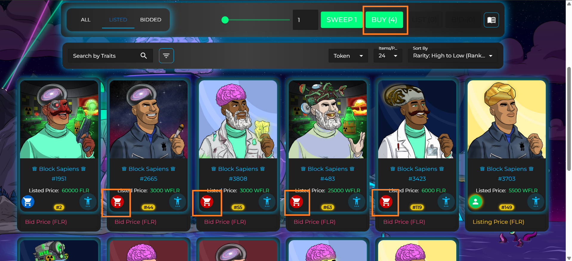 Click on one or more cart icons to select the NFTs you want to buy in a single batch transaction. Once selected, click the "BUY" button near the top of the page to proceed and review your order.