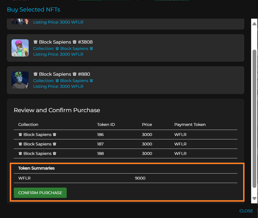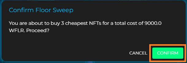 Review and confirm the total number of NFTs you want to sweep, along with the total cost based on the current floor price in your selected token. Press "CONFIRM" to proceed.