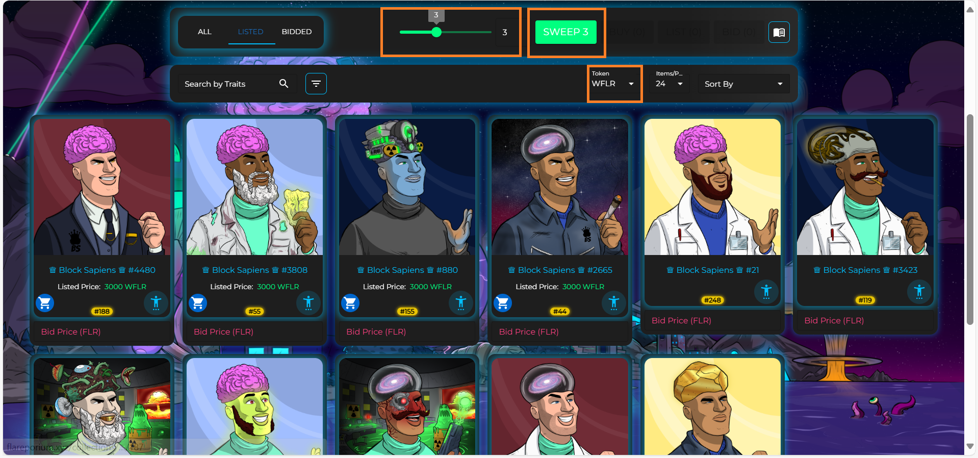 Select the token you'd like to use for filtering listings and making your purchase. Then, use the Floor Sweeper feature to choose how many NFTs you want to buy with the specified token at the lowest available prices within that collection. You can adjust the number of NFTs using either the slider or by manually entering the quantity in the input box next to it.